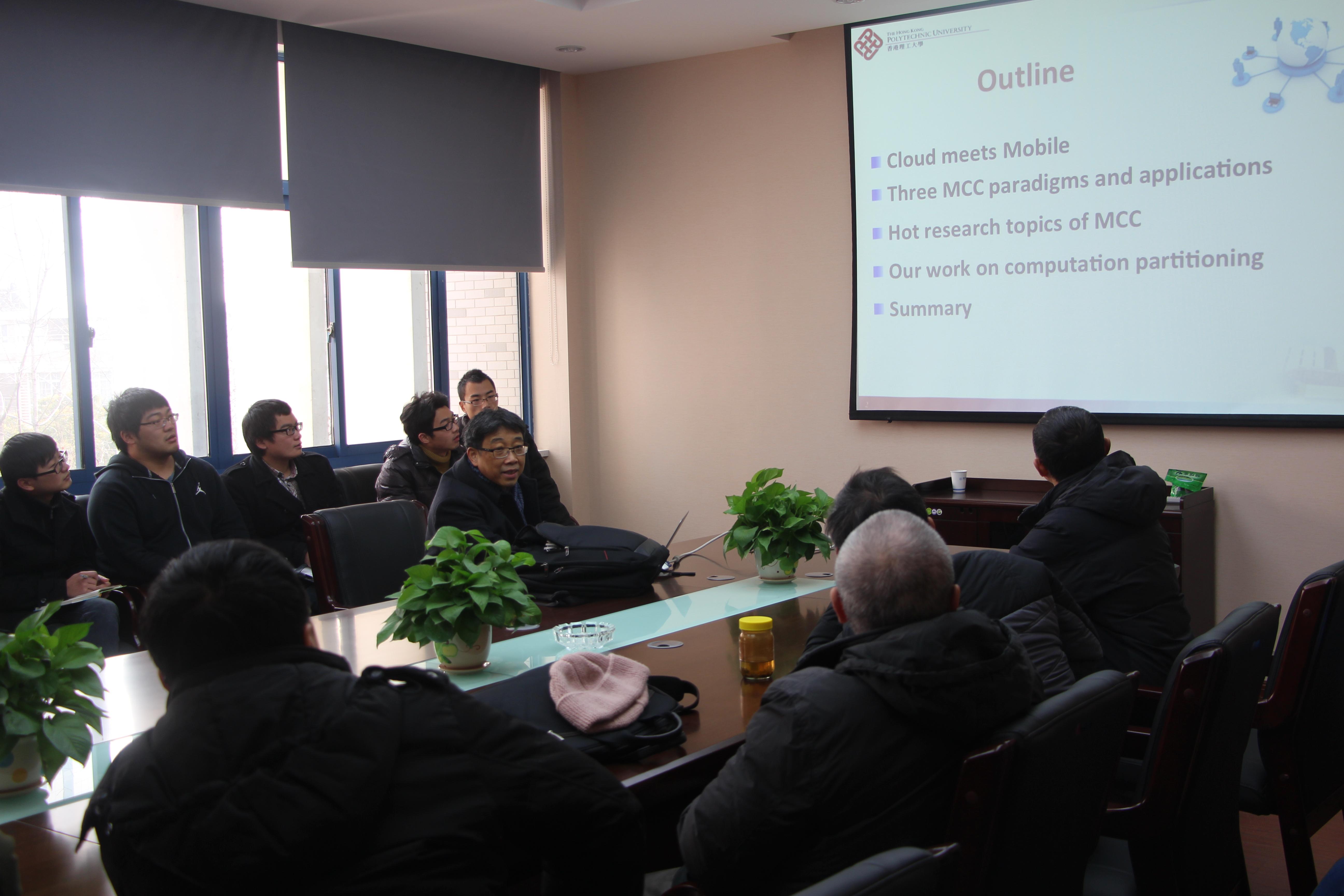 曹建农教授作了主题为关于移动云计算范例和挑战的学术报告。曹教授研究发现移动云计算现已成为云计算的一种新范式,据预测,未来的20年里,移动云计算将会是IT行业选择的平台,会产生巨大的收益。当“云”遇到移动,将会有很多有趣而富有挑战性的问题需要解决。在报告中曹建农教授介绍了移动云计算不同的范式和应用,以及相应的研究主题和富有挑战性的问题,最后还介绍了他正在研究的关于移动云计算的一些工作。我院参会教师与曹建农教授就移动云计算等问题进行了深入地交流和讨论。