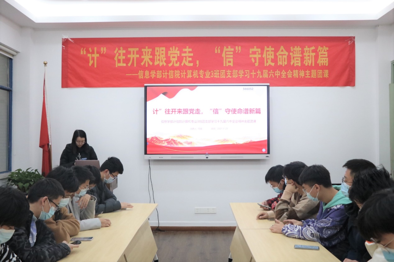 2021年11月25日下午,信息学部计算机与信息学院2018级计算机科学与技术3班团支部召开“‘计’往开来跟党走,‘信’守使命谱新篇”学习党的十九届六中全会精神主题团课。李俊杰常务副校长参加此次主题团课。