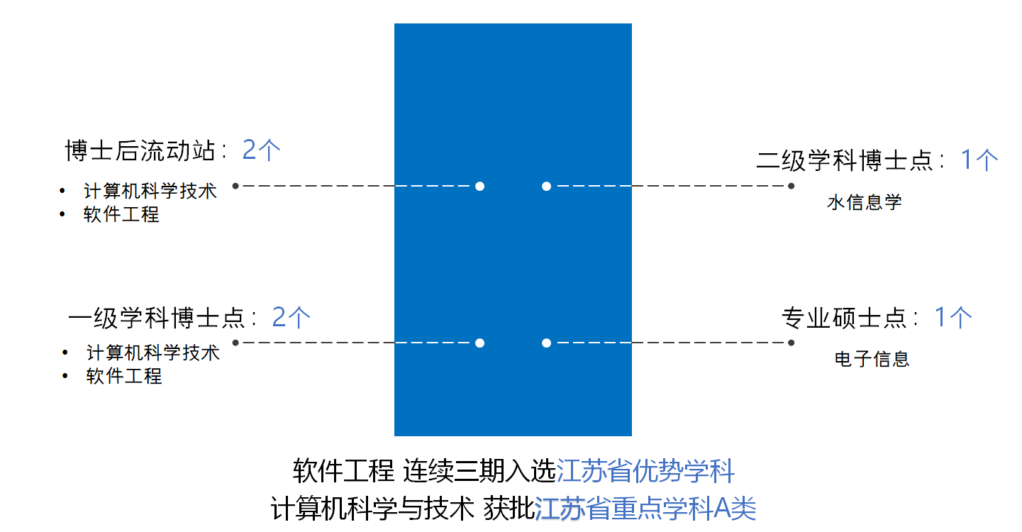 学院通过长期建设与发展,形成了以计算机科学与技术、软件工程、信息与通信工程三个一级学科博士点及水信息学二级博士点、人工智能交叉博士点为主体的、完整的信息学科群,同时建设了电子科学与技术一级学科硕士点、模式识别与智能系统二级学科硕士点,以及计算机技术领域、软件工程领域、电子与通信工程领域3个工程硕士点。学科和机构调整之后,学院现拥有计算机科学与技术、软件工程两个一级学科博士点,计算机科学与技术、软件工程两个博士后流动站,电子信息专业学位硕士点。计算机应用技术学科1996年被评为水利部重点学科,该学科梯队2002年被评为江苏省普通高校“青蓝工程”优秀学科梯队,2017年计算机科学ESI排名进入全球前1%并持续进位,2021年计算机科学与技术学科获批江苏省重点学科;软件工程学科2012年被评为一级学科“十二五”江苏省重点学科,自2014年以来连续两期入选江苏省高校优势学科,2022年以“优秀”通过三期验收。